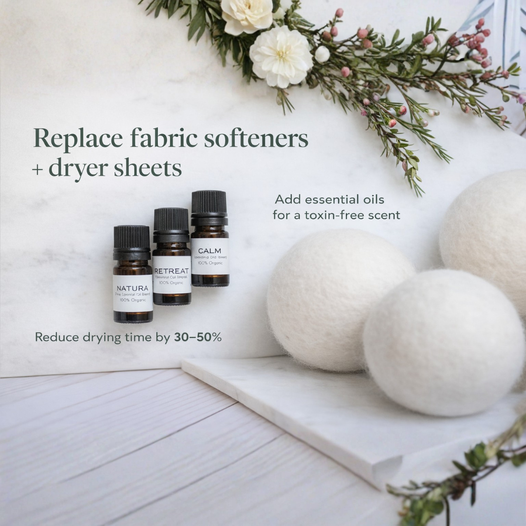 Our Wool Dryer Balls and Essential Oil Blends work together to leave your clothes soft, static-free, and lightly scented with pure, plant-based oils.