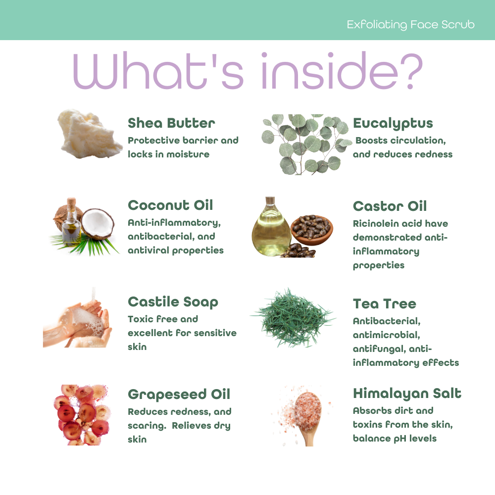 Refresh your skin and soothe fine lines with this luxurious exfoliating face scrub! Made with coconut, shea, aloe butter, grape seed oil, and Castile soap, plus essential oils for extra hydration, it's the perfect way to buff away dead skin cells and reveal you're natural glow. Massage your face, let sit for up to fifteen minutes, and you'll be ready to shine!
